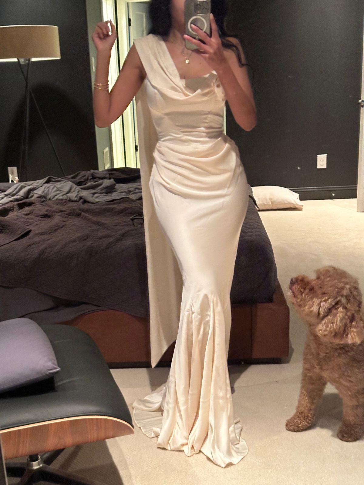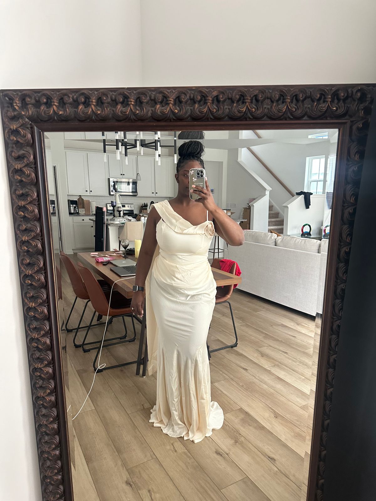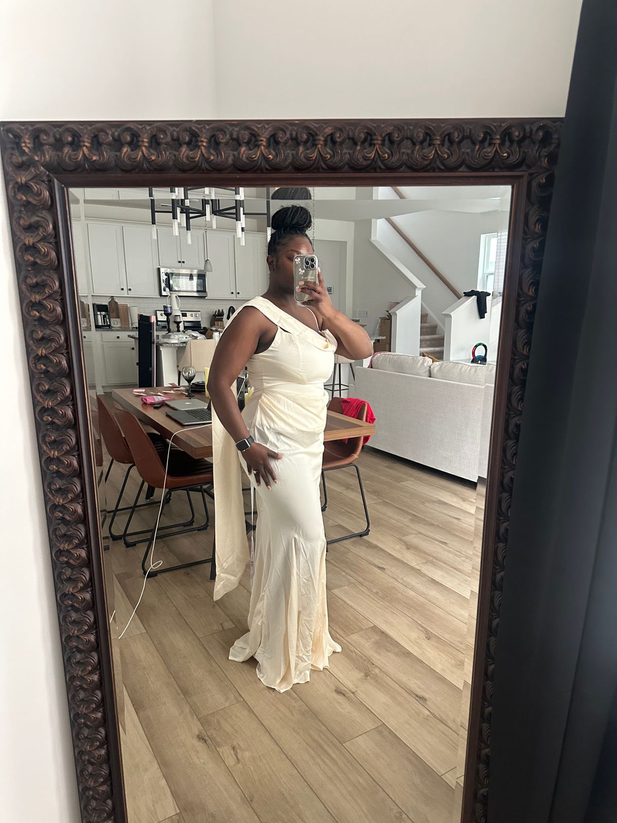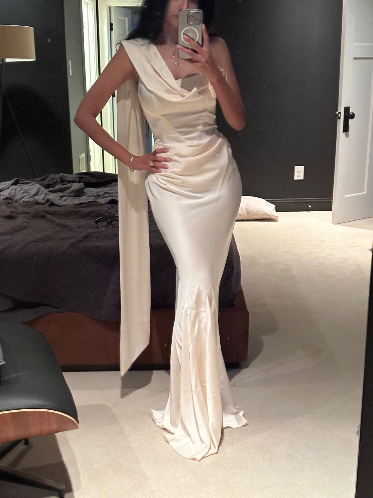Meet our Celine Dress - a luxurious satin gown with corset waistline, draping detail and slightly flared hemline. The right shoulder features a rosette detail while the other is complimented with a longer draped scarf. The corset waist paired with the draping at the hips give a shapely silhouette that compliments all sizes.