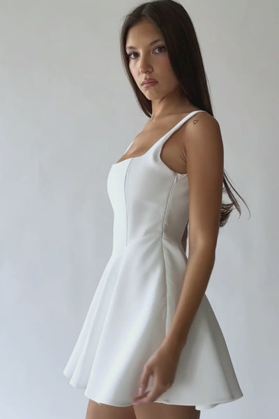 A versatile essential for your wardrobe. This white corset mini dress features a square neckline with straight straps and a sculpted V-shape waistline that creates a flattering and shapely silhouette. Crafted from our premium crepe fabric with internal corset boning, a fully lined skirt, and hidden side zipper. The fitted bodice releases into a feminine skirt that moves beautifully as you do.